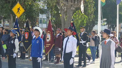 Participación de las estudiantes de Primaria y Secundaria que conforman la Policía Escolar 2023 en la juramentación a cargo del General de la PNP de Arequipa y la presencia del Alcalde de Cerro Colorado Manuel Vera Paredes y los Directores de las diversas instituciones educativas de Arequipa y nuestro Director Johnny Alarcón Barrionuevo y se realizó en la plaza Las Américas.