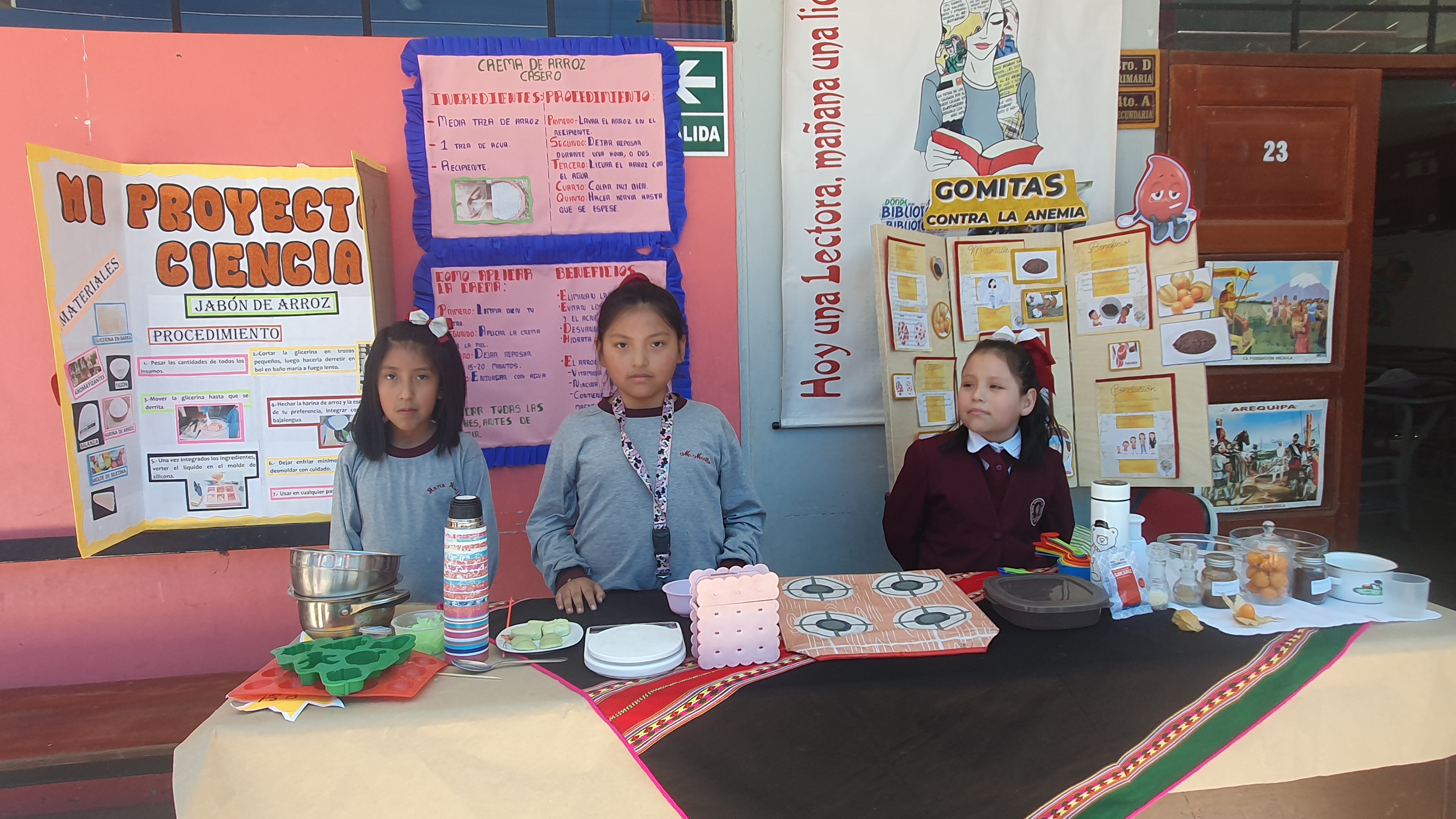 Las estudiantes de los diferentes grados participan en la feria de ciencias, con trabajos elaborados por ellas con el apoyo de os padres de familia.